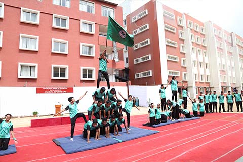 The day commenced with a ceremonial guard of honor and the raising of the school flag. The school's sports contingent, comprised of Pegasus, Phoenix, Orion, and Centaur houses, marched in harmony, accompanied by the school's brass band. Principal Ms. Malathy R Narayan’s welcome address acknowledged the collective efforts of teachers and students that led to the Sports Day's success. The school's brass band’s performance was followed by an artistic yoga display narrating the universe’s creation. Further, the audience witnessed captivating displays from every house, each creatively representing one of the five elements—air, water, fire, earth, and space.