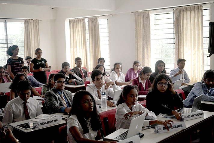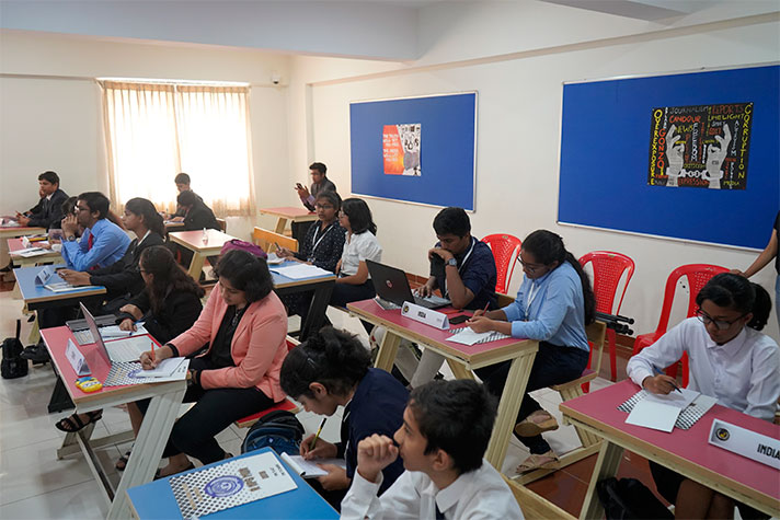 There were 6 Committees namely DISEC, UNSC, The Commission for Reforms in the Education System of India (CRESI), Axis Tripartite, FIFA Council and the International Press Corps- each with challenging agendas involving stimulating deliberations and arbitrations over the 3 days. The delegates were engaged in passionate debates, negotiations, charting out directives, resolutions and defending their stance as diplomats with responsible portfolios to live up to. The Press were at their best covering mind boggling crises and grilling the delegates’ knowledge about everything related to current affairs.