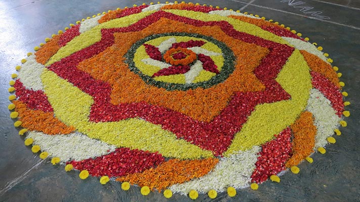 Little did the children know what they would be doing when each class was asked to bring a handful of flowers of specified colours. On the morning of 16th September, the children got busy separating the petals from the flowers which was a fun filled activity for them. Each class was asked to fill in the pattern (already drawn on the auditorium floor) with the flower petals. The pattern began to grow into a huge, magnificent pookalam. It was only after the entire pattern was filled with petals, that the children realized what a wonderful pookalam they had made. It was a delight to the eyes and was appreciated by everyone in the school. The students of all classes visited the auditorium to view the Pookalam made by the little kindergarteners.