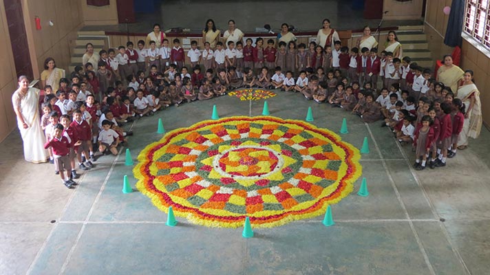 Preparation for Onam celebrations this year at NPS Rajajinagar, was on a grand scale. Students of kindergarten got together in making a huge flower carpet. The day began with lot of excitement and galore when the students removed petals from the flowers they had brought to school. The fun continued as the tiny hands were put together in laying out the large “Pookalam” in the school auditorium with Onam songs being played in the background. The teachers read out the story of Mahabali to the students. Faculty at NPS looked stunning in their traditional Onam sarees and participated in the festive mood.